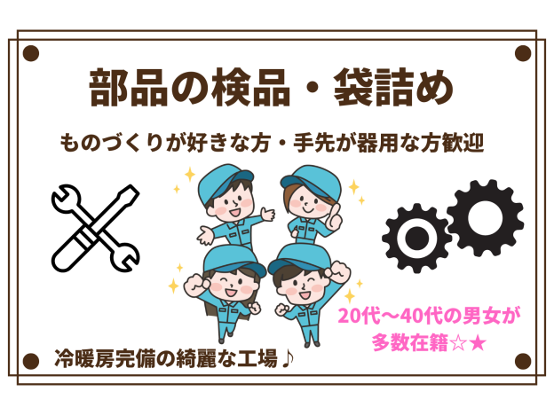 [派]組立・部品はんだ付け【青】 詳細はこちら 自分のペースでモクモク作業! 装置の部品製造にかかわるお仕事をして頂きます。 部品は小さなものがほとんどです。 御仕事の種類が様々なので、適性を見てから配置いたします! 部品を取り付けるはんだ付け、部品の組立て、必要な部品や部材のピッキング、性能チェックなどをお願いします。